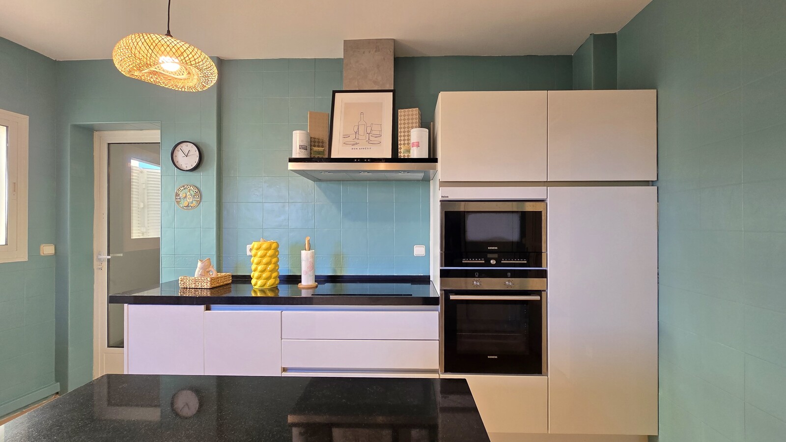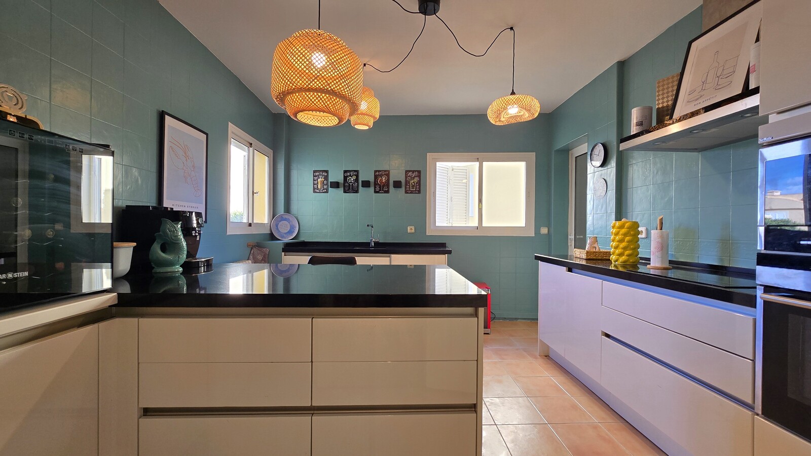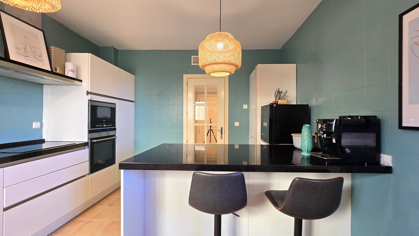 • Fully furnished and equipped kitchen with a large central island, fridge/freezer, induction hob, oven, microwave, dishwasher, wine fridge, and premium coffee machine