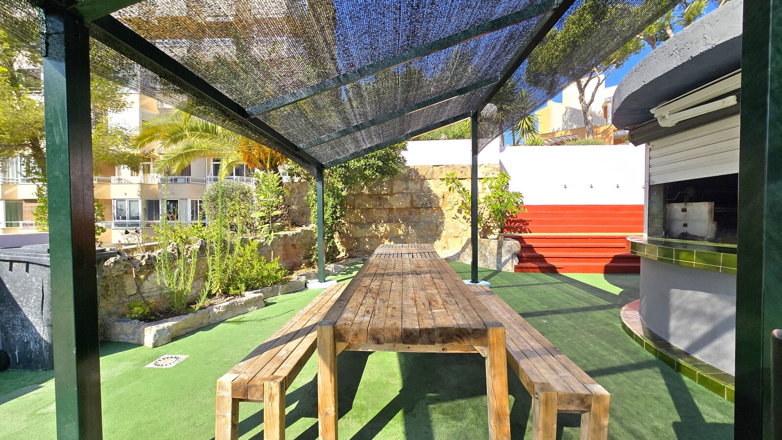 La comunidad dispone de una piscina exterior con zona de tumbonas. La playa está a unos 200m. En los alrededores encontraron unos pequeños comercios locales (supermercado en la planta baja del edificio), el centro comercial Illetas Centre con su supermercado, farmacia, quiosco y centro médico está a menos de 10 min andando. A escasa distancia se encuentran los conocidos Beach Club Las Terrazas y el Puro Beach. El campo de golf de Bendinat y el puerto deportivo de Portals Nous se encuentran muy cerca. El centre de Palma está a menos de 10 min con el coche (parada de bus a 50m), el aeropuerto internacional de Palma a menos de 20min.